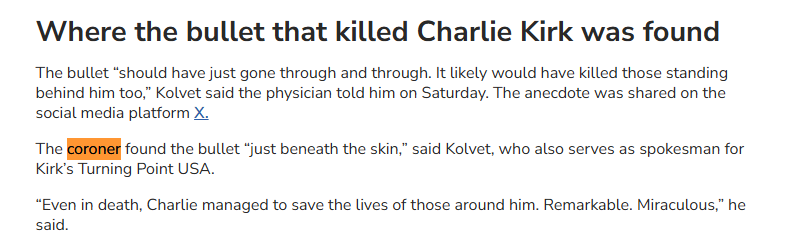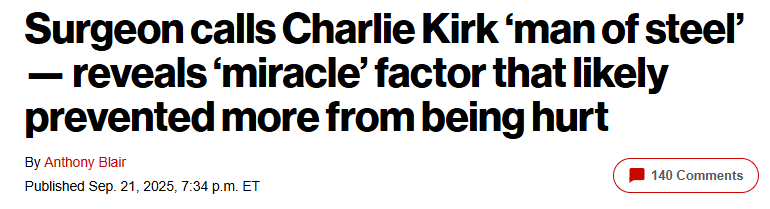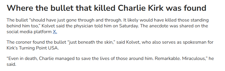 Andrew Kolvet, spokeperson di TurningPoint USA, ha affermato di aver parlato con il chirurgo che ha "lavorato con Charlie". Secondo Kolvet, il chirurgo avrebbe dichiarato che il proiettile non avrebbe attraversato il collo, e che i tessuti ossei di Kirk erano "talmente in forma e talmente densi, era come se fosse un Uomo di Acciaio" (Man of steel).
