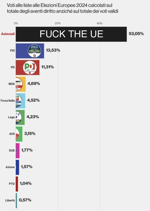 SUE è arrivata a pochi centesimi dalla soglia del 4%. Se io e tutti gli altri ci fossimo astenuti, SUE avrebbe avuto lo stesso numero di voti, ma su un totale di voti inferiore... risultato, avrebbero superato il 4% e avremmo avuto diversi loro parlamentari a rappresentarci.