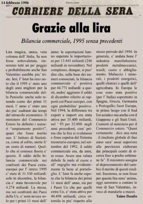 come vedi con la lira (e spesa a deficit dello Stato) il potere d'acquisto è salito fino al 1991, per poi avere una battuta d'arresto nel 1992, resta stagnante negli anni'90, sale un poco negli anni 2000 fino al 2008 per poi iniziare a scendere inesorabilmente e subire, a partire dal 2012, una discesa più ripida, probabilmente la cura "Monti" che in un contesto già difficile per le famiglie ha distrutto la domanda interna per svalutare i salari (non potendo svalutare la moneta) e rendere i prodotti italiani più competitivi all'estero in modo da aumentare le esportazioni.
