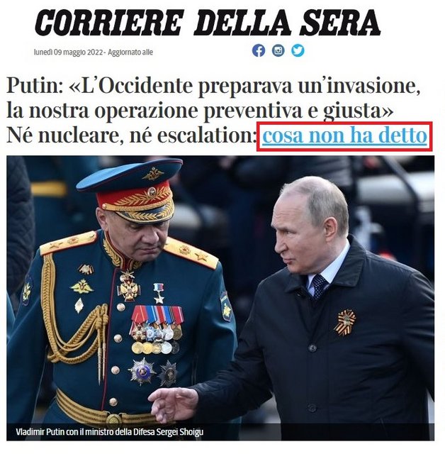 Poi abbiamo i fenomeni della stampa nostrana, che sono così intrisi dalle loro stesse menzogne che volevano decidere loro quello che Putin avrebbe dovuto dire, e quindi si sono "stupiti" visto che Putin poi non ha detto quanto da loro preannunciato: