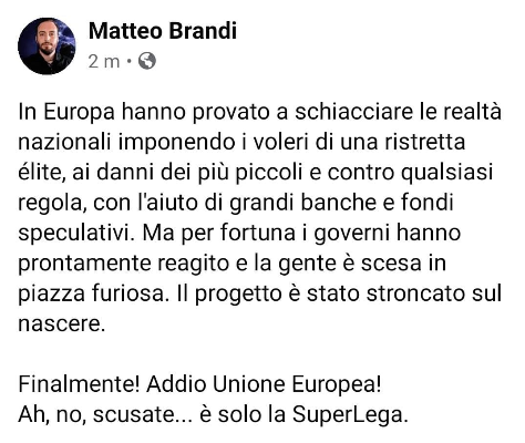 Non poteva essere piu' chiaro Matteo Brandi, la cosa strana e' che anche gli europeisti piu' convinti sono contrari alla superlega, cos'e' paura di prendere schiaffoni appena si mette il naso fuoricasa? Paura di perdere da parte della fgci di Lombardia e Piemonte il padronato sul calcio italiano?