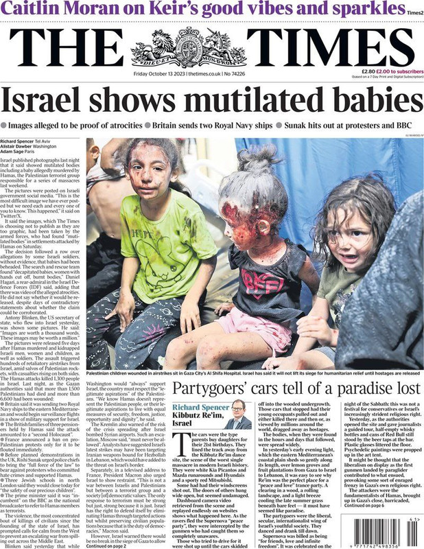 Il Times in prima pagina mette il titolone: Israele mostra i bambini mutilati. Subito sotto una foto che nel lettore lascia intendere che sia la ripresa di bimbi israeliani, mentre solo nella minuscola didascalia si legge che sono bimbe palestinesi di Gaza. Quanti leggeranno la didascalia e quanti invece penseranno di vedere bimbi israeliani, e quindi giustificare il genocidio a Gaza?