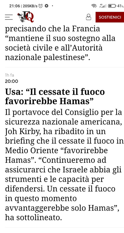 Ho notato che, a parte le reti mediaset tra le quali si distingue rete 4 per accanimento anti islamico e incitamento all'odio, è stata rilevata su alcune delle altre reti, con preoccupazione e in carti casi con disappunto, una certa freddezza e ritrosia da parte dell'opinione pubblica italiana ad appoggiare, giustificandola, la spropositata reazione messa in atto dal governo israeliano ormai finalizzata, se nessuno vi porrà freno, alla pulizia etnica se non al genocidio.