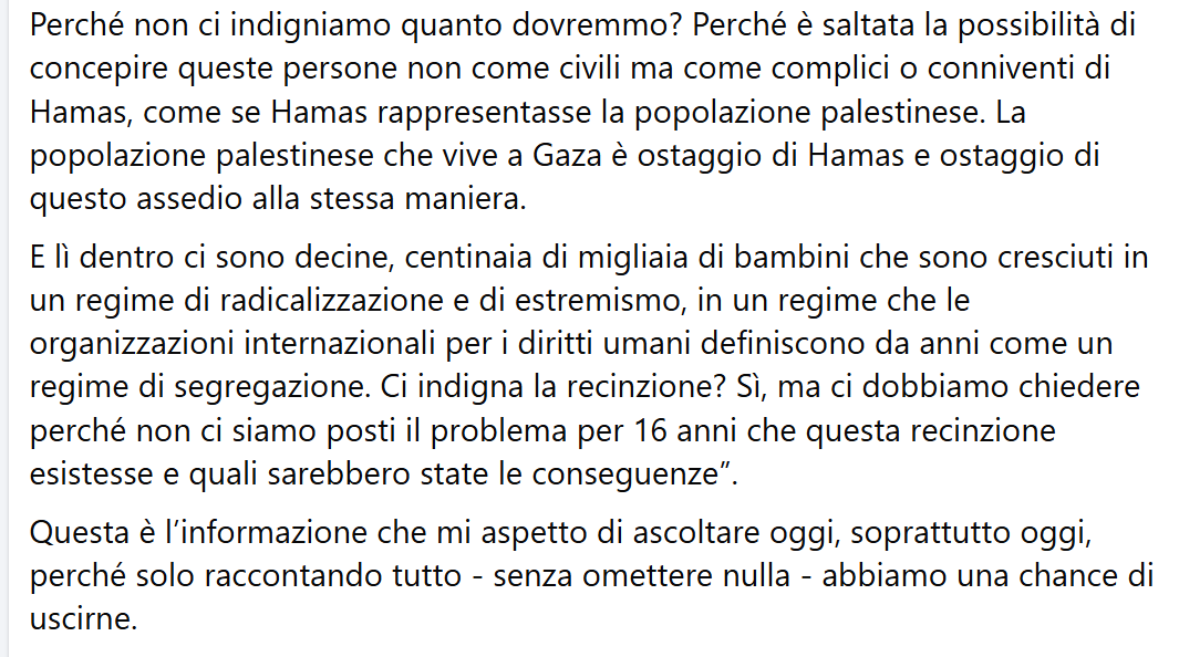 Mi rivolgo direttamente alle istituzioni che oggi hanno scelto l’assenza e il silenzio: è il momento di agire. Fermate questo massacro. Lo Stato italiano riconosca pienamente lo Stato di Palestina e si faccia promotore, con coraggio, di un’iniziativa forte presso la comunità internazionale.
