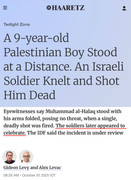 L'ultimo Muhammad al-Halaq, un bambino di 9 anni che se ne stava, a distanza, fermo in piedi e a braccia conserte, quando un soldato israeliano si è inginocchiato e gli ha sparato alla testa. Dopodiché il soldato ha festeggiato il colpo, insieme ad un commilitone.
