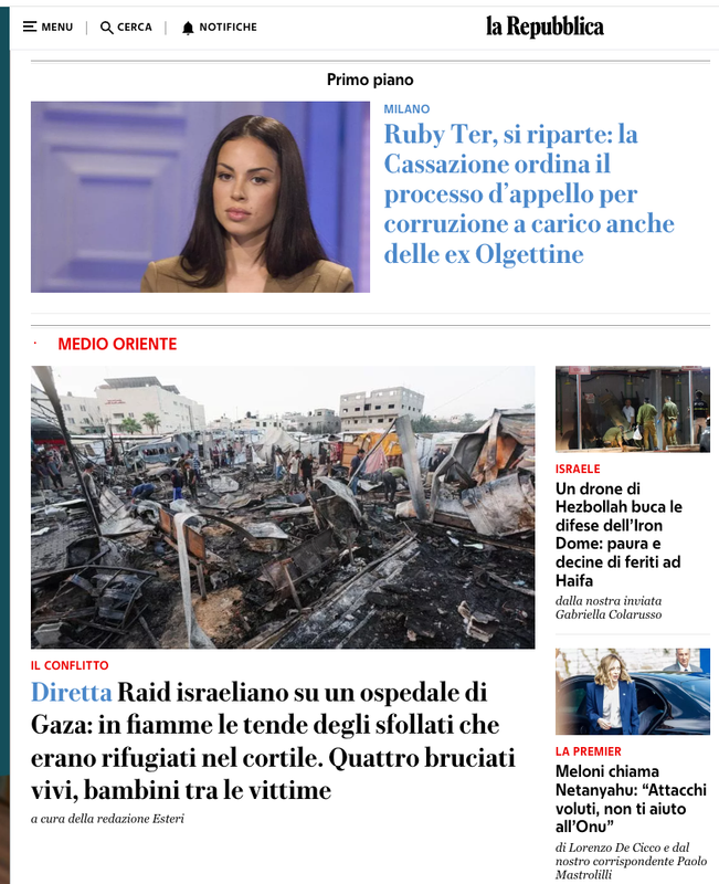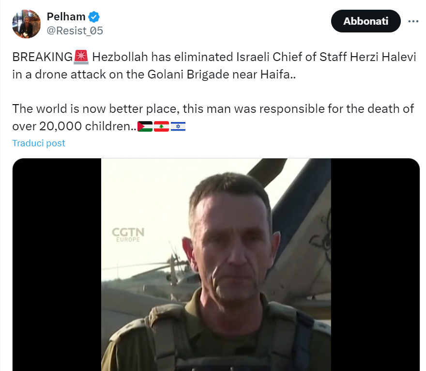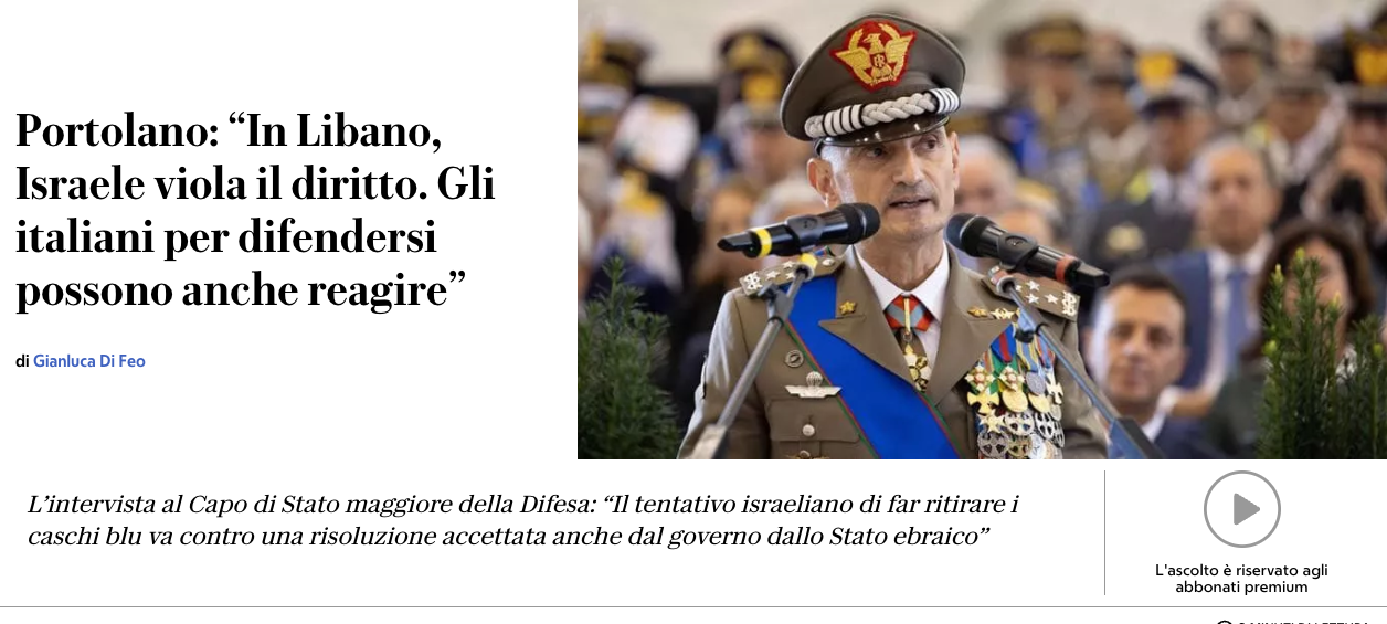 al posto suo ha parlato nel tg ufficiale della Repubblica il fu capo di stato maggiore TRICARICO, nella diretta dell'11 ottobre 13,30 a conclusione del suo intervento mi parve di avere sentito dire han fatto bene gli israeliani, su rayplay non c'è la frase ho sentito male o altro? ma il succo non cambia,la brigata Sassari si merita le bombe, l'idf ha da passà, ascoltate l'analisi di tricarico, fatte contro il suo governo, contro l'esercito, siamo pieni di traditori, mai servirò questo deep state in caso di guerra, ci pugnaleranno alle spalle.