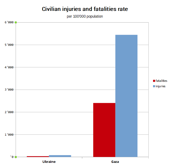 Dato che non ho mai visto in rete un grafico delle vittime civili in rapporto alla popolazione, l'ho fatto io. Tanto per far capire di cosa si sta parlando. E' impressionante.