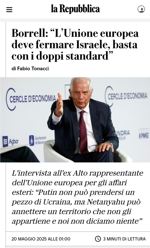 Ficchiamocelo nella testa che l'unico che può fermare il genocidio a Gaza è Trump. Fino ad allora i tre principali paesi dell'UE (+ UK), non possono fare altro che stare a guardare passivamente. Spero che quanto prima Trump si renda conto che sarebbe il caso di rompere ogni rapporto (e complicità) con israele e di favorire l'emanazione di un'ordine di cattura a carico dell'animale feroce, a costo di andarlo a prendere in casa sua.