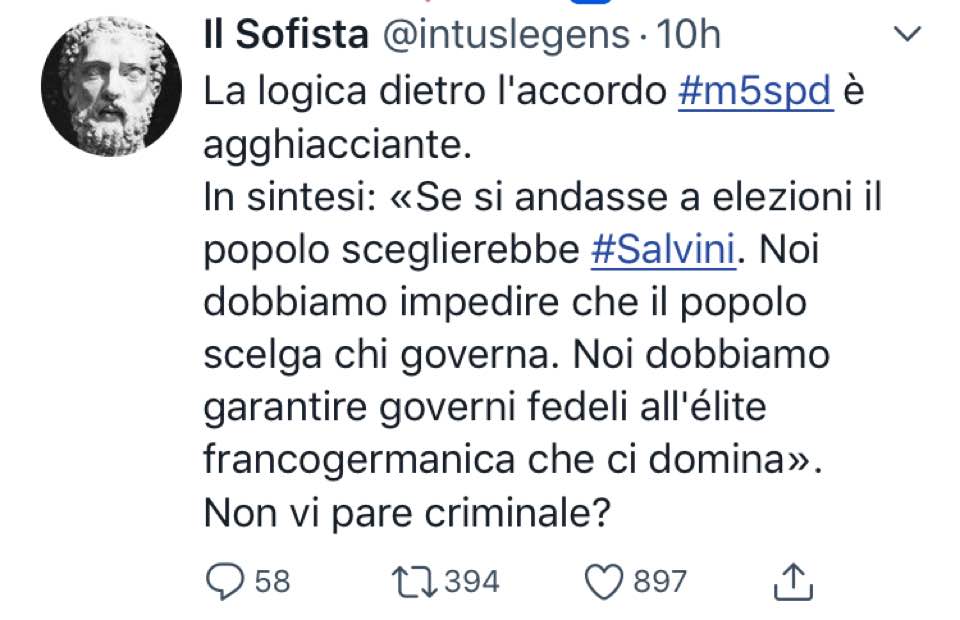 Mi metto nei panni del casual reader e provo a riassumere i commenti letti fino adesso: Era tutto previsto, sono mesi che di maio inciucia con il pd Salvini, di maio, conte sono burattini nelle mani dei russi, cinesi e americani Tutto sto teatrino e' utile per l'agenda.