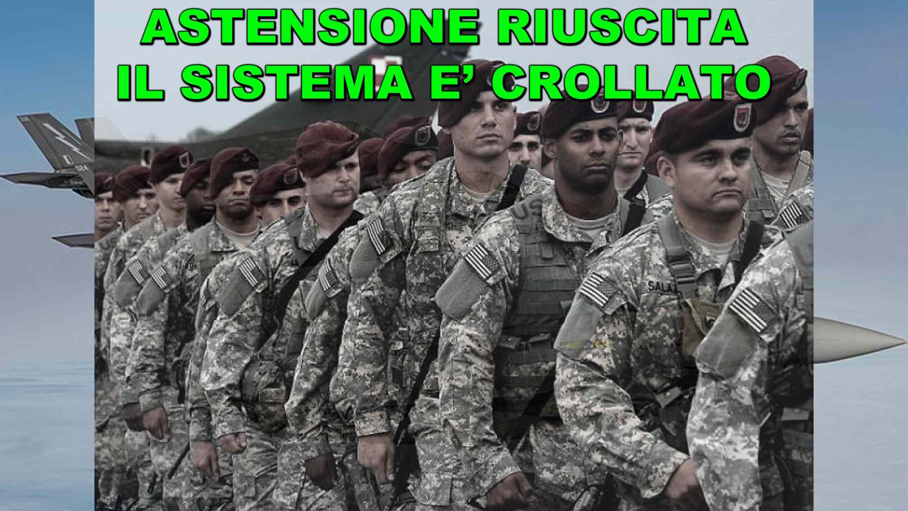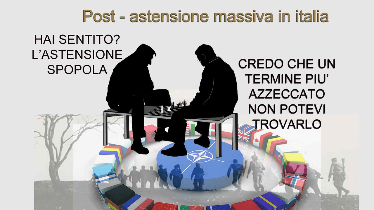 e comunque quelli che sostengono che la strada è quella dell'astensione che quando sarà altissima crollerà tutto... Mi domando, una volta crollato tutto che fanno? La monarchia? Chiamate Leo Zagami dall'America per fare la marcia su Roma e lo incoronate Leo I. Niente più elezioni e obbedirete al re che deciderà come una volta disse lui delle vostre vite? Se il re odina il suddito va anche a morire... Oppure avete altre idee, comunque sempre idee senza elezioni devo immaginare. E come funzionerebbero queste idee? Basterebbe solo fare queste banali riflessioni per capire che è il "dopo astensione massiva" il vero problema, che porterebbe o ad un imperatore, o a altre elezioni. Ma la cosa più probabile è che porterebbe ad un Governo Militare degli Stati Uniti, in collaborazione con la NATO.