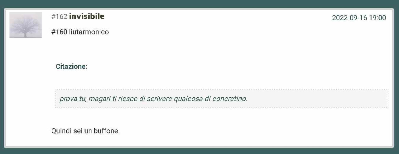 Un mio amico di vecchia data è candidato il 25 settembre con sti cosi in una circoscrizione estera. Quando lo insulto e lo spernacchio per lo schifo che rappresenta sai cosa mi risponde? Che la mela marcia era Di Maio ed era lui a tarpargli le ali. Ma ora che se ne è andato... Il guaio è che lui è davvero in buonafede, non si candida per soldi, già ne guadagna abbastanza. Lui come molti elettori con poca capacità elaborativa mettono semplicemente in funzione quel sistema di autodifesa mentale che ad esempio serve ad autodifendersi e sentirsi al sicuro quando si parla di 11 settembre.