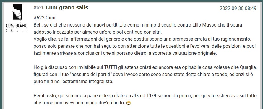 Ma la vera sorpresa – almeno per noi che facciamo parte di questa “area di pensiero” - è stato il completo flop dei cosiddetti partiti antitistema. Di tutte queste persone – Paragone, Montanari, Toscano, Cunial, Schilirò, Rizzo, Frajese, Grimaldi, Puzzer, Teodori, Bianchi, Messora, ecc. – nessuno di loro siederà in parlamento nella prossima legislatura. Nessuno.