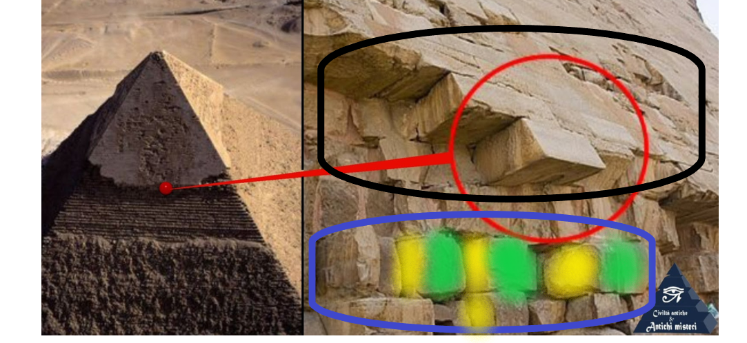 Guardando un’altra immagine del rivestimento esterno di Chefren, rimasto intatto ma alla base della piramide, l’idea che possa essere artificiale rimane……