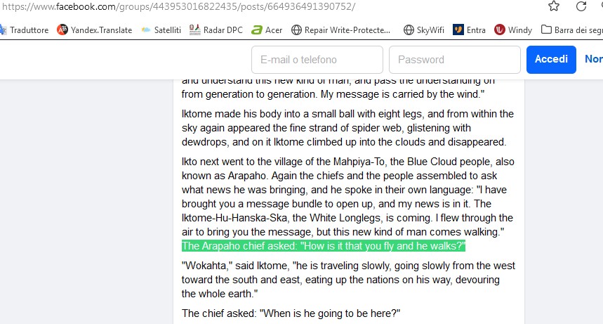 «Forse verrà un tempo in cui voi potrete spezzare il triste collare. Forse potrete cambiare quest’uomo e renderlo migliore, dandogli la saggezza del cuore, facendogli ascoltare quello che le piante e l’erba gli dicono. Ora vi rivelerò il suo nome. Lo conoscerete come washi-manu, ruba-tutto, o meglio con il nome di sottrae-il-grasso, wasichu, perché prenderà il meglio della terra. Divorerà ogni cosa, almeno per un certo tempo.»
